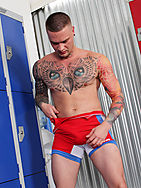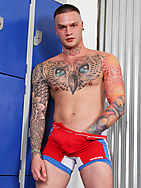 Hunky, beefy and covered in tattoos, Leon Teal is a hot as fuck specimen of young manhood. First off we have a chat with Leon, he’s based in Cardiff and travelled a long way to get to us, which we appreciate! His soft welsh accent is absolute caramel for the ears, cheeky, cute and just a bit shy, he’s adorable! He’s a club DJ playing house and Techno, he formerly lived in Ibiza playing the bars and clubs there. He likes big guys and loves to bottom, so we put him in a hot wrestling singlet with the arse cut out! His peachy smooth bubble butt looks perfectly framed in spandex. His hands start to wander over the fabric, his tattooed muscles and his big bulge. Bending over he shows us his hole, pulling his butt cheeks apart and letting us glimpse at the goods. He licks a finger or two and teases himself, slipping them into his hungry crack and up his fuck hole. Spinning around, all this arse play has got him rock solid, creating a mouthwatering boner concealed in his singlet, practically going beyond his belly button. He teases the head, shaft and every vein we can see before he can’t take it any more and has to get his big cock out, getting it spring out off the top of the singlet as he pulls it down. We can see his tattoos in their full glory now, truly a gorgeous piece of artwork and a whole. He lays back on the bench and wanks himself, teasing his arse more so, showing it off to the camera. He’s ready to blow, sitting up over the corner of the bench he unloads for us making a big sticky mess. Thanks Leon!