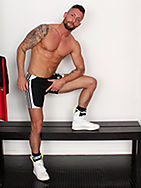 Mega stud Nick North is charming, super cool and always horny. His sports kit can barely contain his bulging muscular frame, his shorts hem straining around his fantastic thighs. Stroking his smooth hard body through his kit, it doesn't take long for him to get worked up and stripped off. Peeling his shorts down, revealing some incredibly sexy white mesh briefs, all mesh. Nicks tanned arse showing through, his hairy crotch and cock bulging and stretching the hatched fibres. Getting hard, he flops his dick out, fully naked in all his glory, dark golden smooth skin, ripped muscle and stiff cock! Beating off and bringing himself to the edge. What a show!