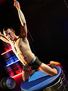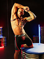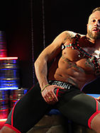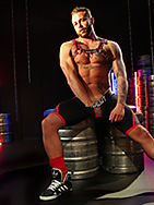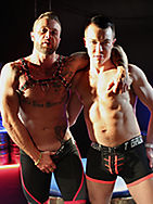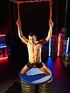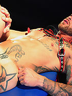 Strung up and left. David Lambert languishes, waits and wonders when his boss will come back. Wrists elevated and tied to each side of the room, knelt up with ankles strapped down. The boy is fixed, still and frustrated. In walks Frank Valencia, a mass of muscles, tattoos and dominance. He teases his boi, playing with his tight and stretched out body, slapping his bubble butt and twisting his nipples hard. Not that David can put up a fight but he is clearly enjoying the torment! Climbing up, crotch to face level Frank gets his hard and super thick meat out. Slapping his victims face and stuffing the full length down his throat, he is just warming up. Building the pace he facefucks David, since there are no hands in the way. Making him gag, spit and drool while he grunts and growls with oral pleasure. Pulling his shorts off, David's hard cock springs out, sliding underneath his raised body he fucks him in the same position. Making him use the ropes as leverage so he can bounce on his thick cock.