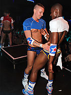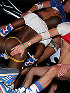 Wearing skimpy briefs, jockstraps and cut-off sports tops, they look every bit HotJock! They start off in separate groups of two, Kayden pairs up with Issac and Tyson with Dave... they get dirty together. Each watching the others over shoulders, teasing the audience and themselves. They suck, play and get hard before they cant take it anymore and make the move together, center stage...