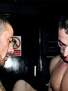 The space is tight but they’ve lots of empty rails to hang from and climb onto, you can tell they’re going to have fun here, turning it into a jungle gym of sex! Kissing turns to sucking and before you know it they’re in a vertical sixty-nine, Marco hanging upside down with his legs hooked over the top rail. Marco then hangs onto another rail, feet up high, giving Jake direct access to his arse so he can eat it. Jake then joins him up on the rail so they can fuck in mid-air, Marco bent over holding the bars, letting Jake pound him again and again. Feet back on the ground, and Marco holding himself up they fuck missionary looking deep into each other’s eyes while Marco cums on his ripped abs. Jake plants his load on Marco’s muscly chest. Back to work boys!