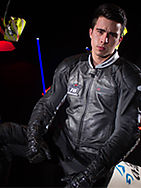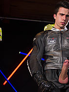 Anonymous hunk number 1 in full motorbike Dainese leathers and black-out bike helmet, seriously expensive kit. This is a man dedicated to his fetish. All black, all leather, everything. Gloved hands move over the stitching and padding of his suit, grabbing his swelling crotch and taking the zip down slowly. He struggles to pull out his rock hard dick and heavy looking ball stretcher to wank himself off.