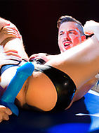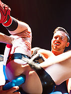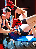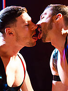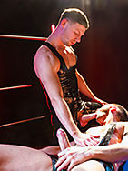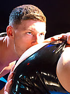 Dom and Sub, Theo & Sam are rubberised and ready. Sam in a black rubber wrestling suit with the ass cut out, flagging red with his bright coloured hightop trainers and socks, Theo looking the full rubber dominant top in slick black trousers, boots and muscle vest. Clean cut and mean.