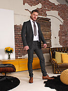 Josh Moore sits perched on the arm of a chesterfield sofa in a grey/brown/mottled suit, looking sexy, brooding, a fireball waiting for someone to try and pick him up! In swaggers Gabriel Phoenix in a midnight blue 2 piece and tie, he catches his eye and walks up to him with confidence. Suddenly startled at the match, Josh rises to his feet proving a few inches of height difference, Gabriel almost steps backwards, not before Josh reaches out to grab him by the neck piece and pull him in for a deep, tonguefuelled kiss. Taking the absolute lead Josh inspects him, snogs him and spins him round to get a good look at the arse he’s going to be fucking. Pushing him into the leather Eames ottoman, pulling his trousers just below his arse, yanking his briefs up then down and giving him a good hearty slap before inspecting his hairy hole with his tongue. Gabriel groans, he likes the rough with the smooth. Josh takes out and lubes up his thick 9” cock from him trouser fly and plunges is straight into bent-over Gabriels arse, willing or unwilling, he’s taking it. He grips on for dear life as Josh really stretches out his hole. Grabbing onto his suit to pull him back into him. Letting up for a moment Gabriel stands up on the chair to give him a height advantage and let Josh suck him off, unbuttoning his shirt as he does, grabbing the back of his head and thrusting, taking every advantage of the moment! Enough of this, Josh grabs him, and pushes him down into the chair, trousers naked off and legs up, he’s going in again! More naked and deeper than before, Gabriel almost looks like he’s struggling to take him but he pushes on, or more Josh does. Taking it like a champ in what’s supposed to be one of the most comfortable chairs in the world, not quite what the designer had in mind for it! On his feet, facing the big mirror so he can fuck him doggy and look him in the eyes at the same time. Really letting rip and fucking him hard, Gabriel can’t contain it any more and shoots a massive load all over the mirror, muddying focus and the reflections, but what a shot! Getting on his knees Gabriel awaits Josh’s fat load on his face, he’s not disapointed.