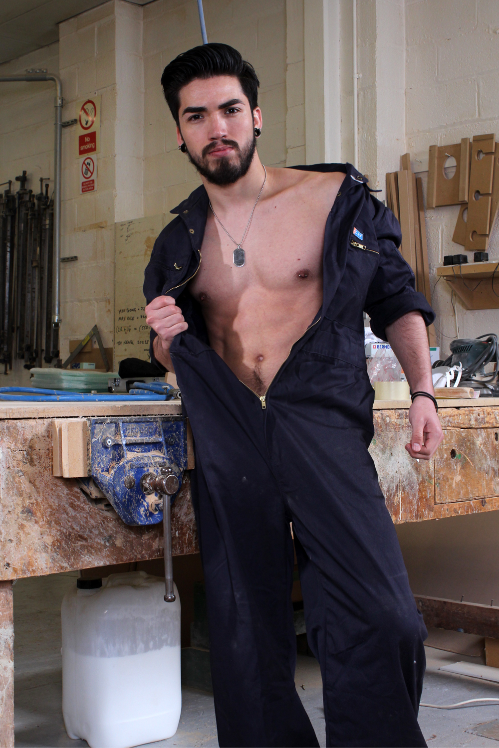 "Fine, I'll just have to get my hands dirty and help out, carry on" Though Alexis can barely take his eyes off Nick as he strips off his shirt for an apron. Offering to help him tie it at the back is his excuse to get his hands on his hot boss. They wander... no complaints. Maybe Nick could do with some stress relief. The apron is off as quick as it was on, they kiss and caress each other, beard rubs against beard and hard-ons against workwear. Nick picks up Alexis and chucks him around the big bench. Both flexible guys, there are some hot as hell positions, open and stretched, a crystal clear view of Nick banging the fuck out of Alexis's perfect arse!