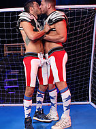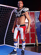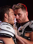Lets immediately get into the hard stuff, amour up, lock heads push those feet into the floor. If it isn’t rough it isn’t fun, am I right? Rico Fatale and Josh Moore stand in matching great, American football shoulder pads and extremely tight padded pants, both guys butts are looking spectacular in them! No messing around, the point of the pads is for something to hang onto and so they can be as rough with each other as possible, testing them out they each give each other a good chest punching which starts to get the boys hard. Their big cocks bulging to one side of the pants, reaching all the way around to their hips! They play with their boners through the fabric rubbing them against each other in a seriously horny display of foreplay. They grab each other and kiss hard, grabbing arses and snogging deep. Rico drops to his knees and peels Josh’s absolutely massive cock out of his shorts, hanging long and hard at over 9” it’s more than a mouthful! Rico gets to work and even deep throats the monster, much to Josh’s surprise! I bet he doesn’t find guys with talented throats like that very often! Getting down to the floor Josh bends over and gets his mouth around Rico’s equally huge dick, slobbering and spitting all over it. Rico take the chance to face fuck him from the floor until he can’t take it anymore! Pants off, Rico bends over, sticks his arse in the air ready for Josh’s warm tongue. He pulls his cheeks apart, spits then dives right in there, getting his hole wet and ready for what’s about to come. Squaring up behind him, Josh pushes his enormous cock against his hole and works his way in… you though Rico was a loud boy before this? You haven’t seen anything yet! Josh grabs him by the pads, smacking them intermittently and thrusting deep into his fuck hole, Rico is loving every second and every inch of this! He takes a turn of backing up onto him, twerking his arse on Josh’s hard cock, his juicy butt bouncing with each shake and thrust. Rico climbs on top to ride him backwards, Josh’s huge dick stretching his tight hole. Swapping between bouncing up and down on him and raising himself up to let Josh power fuck him at like 6 reps per second! I can’t tell at which point Rico is making more noise! Impressive stuff. Grand finale, Rico lays back on his shoulders and Josh towers over him, this is a pile drive fuck of epic proportions. Thrusting straight down into his willing hole, Rico screams with pleasure! It’s all to much for Rico and he shoots a massive load vertically all over his own face… I think the obvious plan is for Josh to add to the lovely sticky mess, which he does! Double face-full!