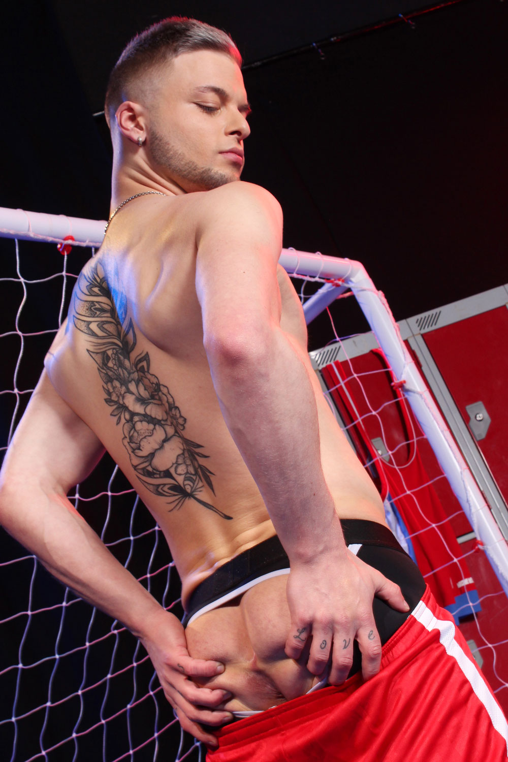 Footie kit clad lads! Two extremely cute, boyish and edgy guys in a red and white kit respectively, they’ve had. A good and friendly game and now it’s time for some off-pitch action. Jeffry Lloyd pulls in younger, smaller Koby for a passionate boner inducing kiss, the ball drops and tents rise in loose silky shorts. The lads aren’t wearing underwear which is quite apparent! Pulling waistbands down one after the other, if you don’t know Jeffrey I’m not sure how to prepare you for this but holy fucking HELL that’s a massive cock! Without doubt one of the biggest we’ve ever seen here at UKHotJocks… and don’t for one second think ‘oh poor little Koby’, this hungry bottom boy is all over this, this is his fucking jam! It’s a matter of seconds before he’s got his mouth around Jeffreys monster meat. On his knees, shirts off, abs-a-poppin’ from both boys, Koby gets to work on stuffing as much of Jeffreys 10” dick down his throat, slobbering all over it, making himself gag and eyes stream with pure fucking joy. Is there anything hotter than a cute boy with a big toy, eyes pouring and staring up at you? Jeffrey wants to taste Koby’s equally skyward pointing cock, gobbling the lot down, letting him totally throat fuck him. Bent down, hole to the sky, Koby presents his tight but very capable arse for a good tongue inspection and a much needed pre-lubrication. Rising up, Jeffrey batters his club sized dick on those pert cheeks and very willing hole. Tip, head, next 3 inches, next 3 inches, next 3… woah. Koby had a look of sheer delight on his cheeky face and Jeffrey looks damn impressed! He spanks his arse in appreciation and starts giving the pounding of a lifetime! Koby is making all the right noises, taking it like a total champ! Pressing him into the floor, Jeffrey really pile drives into the boy. Anyone who knows this position knows that it’s a DEEP one! He’s giving everything he’s got and then some! Spooning around behind him wearing one socks, shin guards and trainers he gives him another full length. Koby yells at him to fuck him and fuck him harder! Jeffrey will show him who’s the fucking boss here! His cock is almost as wide as one of Koby’s butt cheeks, eye watering and amazing! In a finale show stopper Koby gets on top, reverse riding, grabbing the football net for support and moaning the place down… taking cock like no-one we’ve ever seen! Filthy last Koby wants a fateful and gets in position to take Jeffreys load right on his cheek, splat! Which instantly make him spill his load too. Absolutely incredible game!