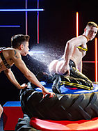 JP sits and waits in black boots, black & yellow striped rubber chaps & jock and matching rubber harness wrapped around his bulging chest. A pint of yellow liquid sits near, JP picks up the glass and gulps down the lot in one go, only spilling a little to glaze his pec’s. Angel joins the scene in a black rubber harness, shorts, socks and boxing boots. They kiss and caress the slick gear, groping all the sexy bits! JP unzips Angel’s shorts and takes his cock out to suck it, getting himself hard in seconds and pulling his big dick through the side of his rubber jock and showing off a yellow ball stretcher. Lying back JP gets ready to receive some juice straight from the tap. Angel soaks him spurring him on to piss as well, two warm yellow streams crossing each other and covering JPs muscular body. Lying back, head over the edge of the tyres JP asks Angel to fuck his face, which he does with gusto! JP pisses over himself again as his throat takes some horny punishment.