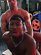 JP Richards is mid-way through a PT session from hunky Wade Steel. He’s training him hard, correcting his techniques and pushing him to go harder. JP is on the leg extension and is incorrectly lifting his core up from the bench, Wade tells him he need to stay flat and presses his hand into the small of his back to keep him down. He counts him up, 1-10 and JP’s tight bubble butt is too much temptation for Wade, his hand slips lower, creeping into his short shorts and exposing the top of his crack. This is now definitely less about the workout and more of a count-up to when things are going to explode in passion. JP’s jock is exposed, Wade tugging on it with his fingertips before his lifts his head up from the bench and pulls him in for a kiss. A tender start to the fucking frenzy that’s about to happen! Getting up they strip each other Wade’s giant muscular frame is something to behold and clearly the body of someone who spends a lot of time in the gym. JP sucks and bites on his nipples, getting his cock hard for a good sucking. Springing the monster out of his joggers JP drops to his knees and sucks Wades massive hard cock, taking a face fucking. Wade pushes JP over the bench so he can get at the hot arse he’s been admiring. Spitting on his hole, rubbing his stubbly face and shaved head in it, loosening him up with his tongue before making JP sit down and ride him. They balance on the equipment and bounce up and down taking Wade deep in his sweet brown hole. Manhandled and pushed over into doggy position, JP really takes a pounding now.