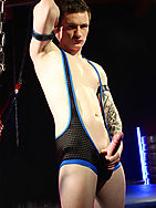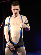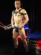 Hog-tied and isolated Yoshi Kawasaki lies in wait. He wriggles and pants like the little piggy boy he is, anticipating his masters’ return and what might be in store for him next. A harness, boots, jock strap and halogen lights are all that’s keeping him warm. Daniel James walks over to him smooth and cocksure, stroking his defenceless back and arse and rubbing the bulging crotch of his wrestling singlet in his face. Stretching the scooped waistband down and down, there’s something very big in there just aching to get out. Slapping his massive slab of meat on Yoshi’s face, brandishing his weapon and telling him what he can do with it. Getting his mouth around his cock, Yoshi is starting to enjoy being so restrained now. He is now just a device with two holes to be used… and he likes that.