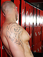 After a hard workout Harley likes nothing more than relieving the tension, usually by taking it out on some guy but since he's on his own, he'll have to make do. Stripping off, he watches himself in a mirror opposite, there's some real hot self-love going on here! He grabs a bottle of baby-oil and begins to pour it over that massive chest of his, rubbing it into his pumped up body, over his unique tattoos and pale skin, sliding his hands down into his jock. He sloshes more oil onto himself, soaking his big cock and balls. Leaning up against some lockers, he tugs away at his slippery dick, getting harder by the second. Looking for something to fuck, he pulls out a clear flesh jack and some lube. Filling up the jack with lube he forces his fat bulbous cock head into it, thrusting and pumping as it constricts his dick. He grunts and groans, enjoying the experience. Building up the tempo he reaches an almighty climax, pulling out and beating furiously, spraying his load everywhere!