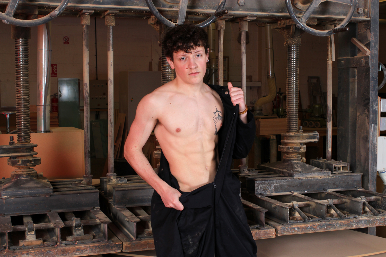 A well deserved tea break and a friendly chat seem sot be all that's on offer here, from James's point of view. Liam asks how he's getting on and says what a great place it is to work in, he's clearly just buttering him up for another initiation to the wood work business! Taking the cuppa out of his hands he suggests an extended break time and before James can question him his tongue is down his throat. Hands wander over overalls and find their way inside. Liam is strong, big and muscular and really takes control of the situation. The contrast of burly Liam and super lean James is breath taking, the work gear comes off and the fuck against the big press, thick Liam pressing into James's tight hole! James really does like working here, this is his second fuck from a member of staff in as many days. James pushes back hard on Liam's hard cock and body, bounces on him and takes a serious pounding before being splattered with spunk!
