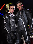 Another fully clad figure appears in the darkness, only the neon tubes reveal him, reflecting on his polished helmet. These men get closer together, and hands wander in mutual appreciation and intense sexual tension. Biker number 2 gets his cock out too, an absolute whopper! Our first guy undoes his helmet.. and Sam Barclay drops to his knees to worship this magnificent dick. Split and slobber everywhere, the way Sam knows best. Faint groans can be heard from the other helmet which is also coming off to reveal Brute Club. The anonymity has gone but the fun is just beginning. Brute starts to strip himself while Sam works hard on his epic piece, he wants this bad! Brutes hard, pale skinned body peeking through the open biker jacket and his hand hold onto Sam's head as he thrust harder and harder. Sam gets on his feet to unzip his full suit, if he wants that cock in him he'll have to shed some leather.