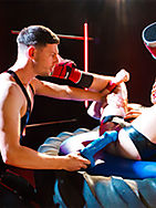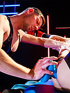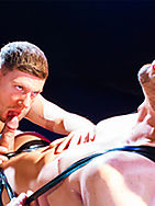 Dom and Sub, Theo & Sam are rubberised and ready. Sam in a black rubber wrestling suit with the ass cut out, flagging red with his bright coloured hightop trainers and socks, Theo looking the full rubber dominant top in slick black trousers, boots and muscle vest. Clean cut and mean.