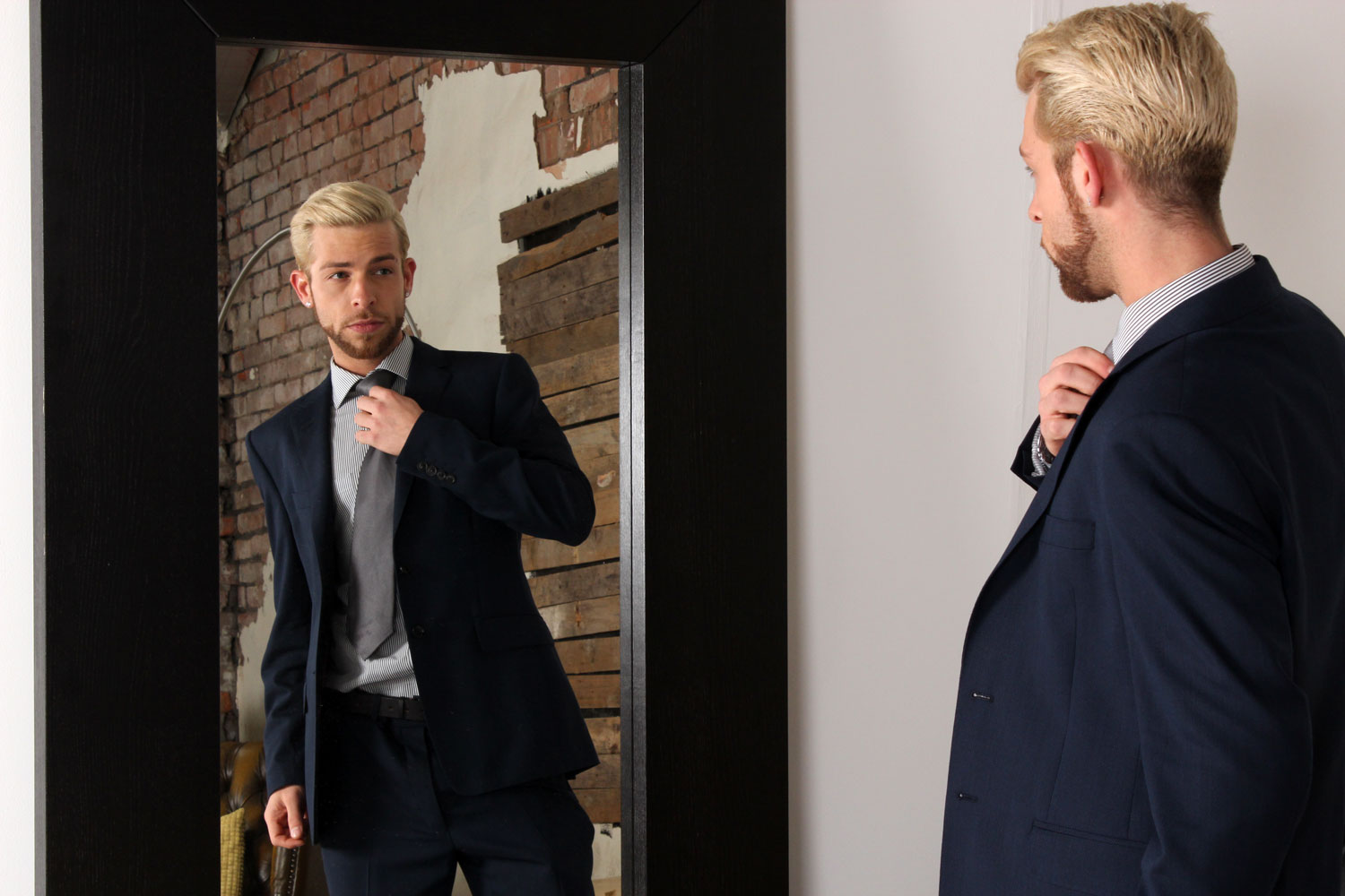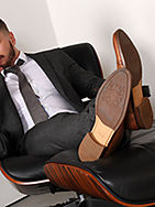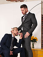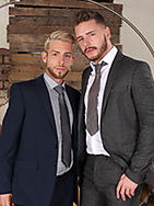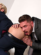 Josh Moore sits perched on the arm of a chesterfield sofa in a grey/brown/mottled suit, looking sexy, brooding, a fireball waiting for someone to try and pick him up! In swaggers Gabriel Phoenix in a midnight blue 2 piece and tie, he catches his eye and walks up to him with confidence. Suddenly startled at the match, Josh rises to his feet proving a few inches of height difference, Gabriel almost steps backwards, not before Josh reaches out to grab him by the neck piece and pull him in for a deep, tonguefuelled kiss. Taking the absolute lead Josh inspects him, snogs him and spins him round to get a good look at the arse he’s going to be fucking. Pushing him into the leather Eames ottoman, pulling his trousers just below his arse, yanking his briefs up then down and giving him a good hearty slap before inspecting his hairy hole with his tongue. Gabriel groans, he likes the rough with the smooth. Josh takes out and lubes up his thick 9” cock from him trouser fly and plunges is straight into bent-over Gabriels arse, willing or unwilling, he’s taking it. He grips on for dear life as Josh really stretches out his hole. Grabbing onto his suit to pull him back into him. Letting up for a moment Gabriel stands up on the chair to give him a height advantage and let Josh suck him off, unbuttoning his shirt as he does, grabbing the back of his head and thrusting, taking every advantage of the moment! Enough of this, Josh grabs him, and pushes him down into the chair, trousers naked off and legs up, he’s going in again! More naked and deeper than before, Gabriel almost looks like he’s struggling to take him but he pushes on, or more Josh does. Taking it like a champ in what’s supposed to be one of the most comfortable chairs in the world, not quite what the designer had in mind for it! On his feet, facing the big mirror so he can fuck him doggy and look him in the eyes at the same time. Really letting rip and fucking him hard, Gabriel can’t contain it any more and shoots a massive load all over the mirror, muddying focus and the reflections, but what a shot! Getting on his knees Gabriel awaits Josh’s fat load on his face, he’s not disapointed.