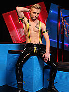Cute boy turned filthy submissive rubber slut, Koby Lewis caresses his black and yellow slick gear, feeling every thigh muscle, every visceral ridge and a hardening bulge behind his cod piece. He’s hungry, in need of something very big to satisfy him. A curious Kayden Gray appears, looking smoking hot in chaps, Jock and harness, all black. He’s on the hunt for a boy to use and use hard. From the bottom crevice of his back to the top, Kayden runs his wet tongue up Koby's skin. Unzipping his peachy rubber clad arse and slipping his fingers in, he's a man who takes what he wants without question, also doing him a kindness, warming his hole up for the sever arse stretching experience that's about to happen! Deep intense kissing leads to dominant control. Unleashing his 9.5" of superior meat, he needs some attention and the chance to get Koby's appetite extremely wet. A sloppy, spit fuelled suck job still isn't enough to open his throat enough to take that monster but there are other holes to use. Koby's cute bubble butt is ready and capable, Kayden slides in, slowly stretching his ring to full capacity. Easing and teasing becomes a brutal pounding, merciless and unrelenting. Cutie Koby is a champ, moaning and loving it! Sling time, the boy hops in and spreads his cheeks in further anticipation. Giving Kayden full control of motion and his fuck hole, he pulls the chains and creates a rhythm to suit the pleasure of his dick. Sweat building, hole gaping Koby is getting seriously fucked! Time to take back a little control, Koby climbs onto Kayden and lowers him self down to his balls, flexing his hip muscles and rocking back and forth, clenching his abs and taking all of Kayden's impressive cock. This is a real show and Kayden is loving laying back letting the boy do all the work! Thrusting up, he holds him at a level and drills the fuck out of his arse, making Koby blow a big load over his tight abs and shiny black gear. Putting him on his knees Kayden positions himself over his willing face ready to shoot. Letting him have it, he plasters his sweet tanned features and right through his hair, messed up and thoroughly satisfied!