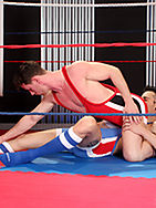 I’ts red vs blue and Anthony vs Timmy in Round 1. The boys are pumped up and ready to get it on. Squaring up and going to the floor, foreheads pressed together and arms around the back of each others neck, they stare each other down before something snaps, the red mist descends, everything tightens and they start to throw each other around. Crotches are grabbed, bums get slapped and forced rimming submission holds… we know where this is going. Anthony seems to have won this one though he’s tenting in his suit, there’s something big in there that has a battle of it’s own to fight! Timmy is pinned down though not complaining. He’s face to boner-bulge and gives the material covering Anthony’s dick some attention, soaking him through. He springs out his massive skyward pointing 8” cock and rubs it in Timmy’s face, forced sucking and press-up position skull fucking, he means business! Letting Timmy up and taking the singlet straps down Anthony goes down to suck his dick. In a squat/go/ready position Timmy arches back onto Anthony’s big dick, giving him the option to take control and ride him, or lose it and get fucked stupid! Naturally we see a bit of both, Anthony’s slick cock plunging deep in and out of Timmy’s tight and smooth fuck hole, grabbing his waist for stability and power.