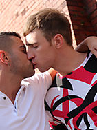 Kayden sits alone, the sunlight warming his face, the cold stone keeping his butt cool. Robbie spots him from a distance and approcahes with a slow caution. There is however an instant attraction, the cautious walk turns into a tense sexual game. Nose to nose, the temptation to kiss gets too much and they explode in sensual passion. Stripping off their outer layers, tight, pumped muscles are exposed to the warm light of the sun and each other. Nipples are hard as nails and dicks bursting out of briefs. Kayden pushes Robbie to his knees and unveils his 9.5" monster to the surprise and delight of Robbie! He slicks his shaft up, goes deep like a pro and sucks him hard. Lifting Robbie up onto the wall behind him, Kayden gobbles on his equally big dick, deep throating and spitting all over it. It's a battle of big cocks but in this case, Kayden wins and takes his trophy to an open windowsill to fuck him. Robbies facial expression says it all, he is BIG but sensual. Fucking him in all sorts of positions, the light gracefully frames them. Things get hard and frantic, Robbie takes a fucking hard pounding and loves every second! Messy ending all over the hot bottom boy completes a fucking hot and beautiful encounter.