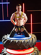 JP sits and waits in black boots, black & yellow striped rubber chaps & jock and matching rubber harness wrapped around his bulging chest. A pint of yellow liquid sits near, JP picks up the glass and gulps down the lot in one go, only spilling a little to glaze his pec’s. Angel joins the scene in a black rubber harness, shorts, socks and boxing boots. They kiss and caress the slick gear, groping all the sexy bits! JP unzips Angel’s shorts and takes his cock out to suck it, getting himself hard in seconds and pulling his big dick through the side of his rubber jock and showing off a yellow ball stretcher. Lying back JP gets ready to receive some juice straight from the tap. Angel soaks him spurring him on to piss as well, two warm yellow streams crossing each other and covering JPs muscular body. Lying back, head over the edge of the tyres JP asks Angel to fuck his face, which he does with gusto! JP pisses over himself again as his throat takes some horny punishment.