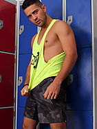 Sultry and cute Robbie tells us a little back story of himself, mixed nationality of American and Spanish, single but happy and loves masculine, muscular guys, if they happen to have a big dick and a great ass all the better! Starting the action off with a quick pump-up workout, he works his chest, biceps and triceps. Press ups and tricep dips get the blood flowing and his perfectly tight muscles flexed before he strips off for the cameras. Tearing off his neon green vest and peeling down his sporty shorts over his awesome buns, he can't wait to get out his goods and show off! Springing out his enormous cock, this boy has some impressive proportions! He may be short but he's absolutely packing in the front and the back. A perfect versatile guy, just how could you choose between either side of newly minted porno-boy coin? He shows off his hole to the camera, entirely edible! Turning around and whacking off that massive 8" cock, ever so slightly curved, perfect for gripping and for deep-throating. He relaxes and beats off, spraying his load wherever it lands.