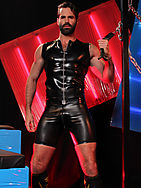 Absolutely smouldering in rubber, Dani Robles rubs his hands over his slick and tightly latex clad body, waiting for a boy to join him in the Rubergeddon play pit. Aarin Asker swaggers up to him, cheeky, sexy and with bulging muscles. The big pig emblem on his chest suggests he'll be up for some hard and filthy play. They explore each other, gripping firmly and pulling on another in for a passionate and spit fuelled kiss. Unzipping his crotch and taking out Dani's hard cock to suck, he drops down to his knees and goes hell for rubber, spitting, sucking and swallowing the lot! Dani face fucks him, grabbing the back of his head and pounding his mouth. Aarin climbs up high and gives Dani a taste of his own medicine, slapping his face with his big dick and spitting down at him as he sucks. Throwing him in the sling, Dani takes back control, fucking the life out of him and making him shout and swear the place down! Chains rattle, the combination of a loud American bottom boy and a fiery hot spaniard going at it hard is enough to give anyone a boner, purely on the audio! Getting him out of the sling and making him do some work, Aarin positions himself over Dani's dick and rides him, bucking and rucking, he puts on a real show, giving it everything he's got! Opening his fuck hole, taking him as fast and deep as he can. Shooting his creamy load over himself, white droplets and jets cover the black and shiny body of his gear. Dani pulls out and blows his loads over the still very willing boys face.
