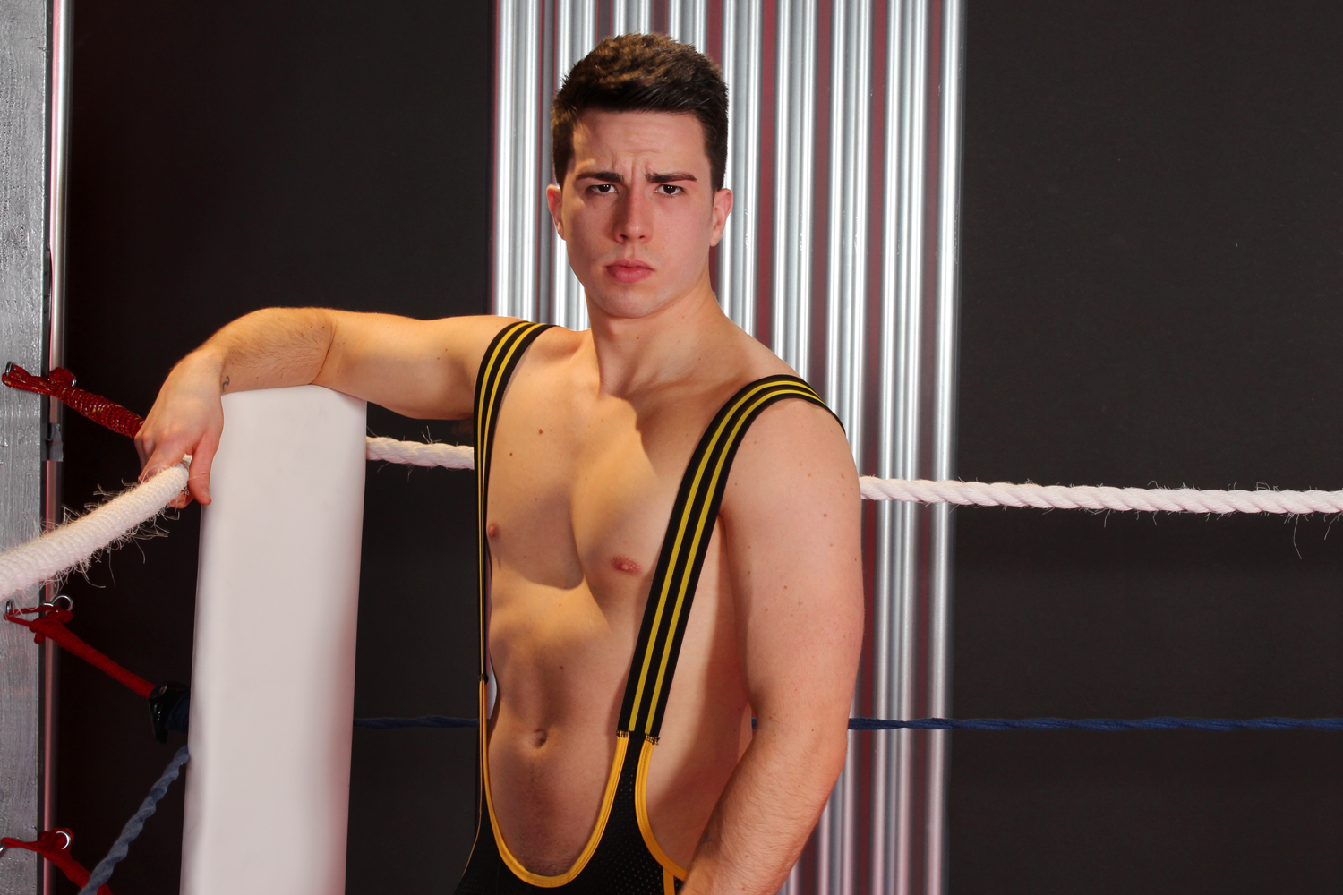 Yellow vs Red and Brute vs Theo. Both guys are in matching style wrestling singlet’s but in opposing colours, Theo Reid in a white and red, Brute Club in Black and Yellow. Both guys look sexy as fuck, the singlet’s are more like shorts with straps attached, they don’t leave much to the imagination! The guys are psyching each other out right from the start, Theo keeping his body warm by bouncing up and down, Brute gives him that steely stare that he does so well, you know he means business. Squaring up, sizing up before bursting out into a double headlock and taking each other to the floor. This feels like a real power battle, both guys are pretty evenly matched in height and size and control of the floor flips both ways a lot. They really go for it, throws, grappling and pinning each other down, which they’re definitely both enjoying. Theo is on top of Brute and in a moment of tense hesitation they almost kiss, Brute flips him over into the same position and takes a final charge and snogs his face off! Crotches rub and grind together, Brute is too hard to keep his giant dick in his suit anymore, so gets it out and straight into Theo’s mouth. He takes his time and gets Brute to the point of bursting with excitement, licking his balls and up each side of his long and chunky cock before taking as much of hit as he can down his throat. Brute is laid down at first enjoying his cock being worshiped, the he gets up, his fully super-hard dick standing proud, glistening and still being sucked on. In another wrestling move, keeping it all aggressive Brute flips Theo onto his back and tears off his singlet, pushes his legs back and delves into his ass, tongie and fingers, slapping his butt cheeks and warming up his hole for the monster cock that’s about to come. Preparing to fuck, brute smacks his dick on his hole, getting the blood pumping even further, he slides in, Theo gasping and grimacing before accepting his cock and fucking loving it! Using Theo’s leg as a lever he fucks into him, hard. Getting onto his hands and knees Theo prepares to take his cock doggy style, pretty intense when 9” comes at you! Pounding the fuck out of him and making him moan louder than ever, both guys glimmering in sweat. Another wrestle flip and Theo is back on top, squatting on his cock, taking him balls deep and riding him like he’s trying to get the cum out of him. Rocking back and forth Theo jerks his cock until he explodes all over Brute. Pushing him off, cum covered Brute wanks off over Theo’s open mouth, spunking a huge load over his face and in his gob, taking the time to go down and share a cummy kiss with him. Beautiful finish guys!